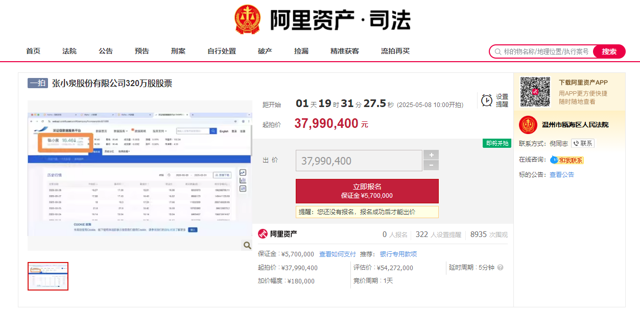 日前,阿里拍卖出现一则引人注目的标的物信息——张小泉股份有限公司320万股股票。根据拍卖标的调查情况表,这批股票归属于被执行人杭州张小泉集团有限公司,处置单位为温州市瓯海区人民法院。经评估,这批股票市场价值达5727万余元,起拍价定为3799万余元,且竞买人需缴纳高达570万元的保证金。